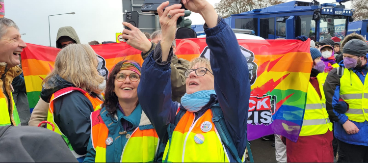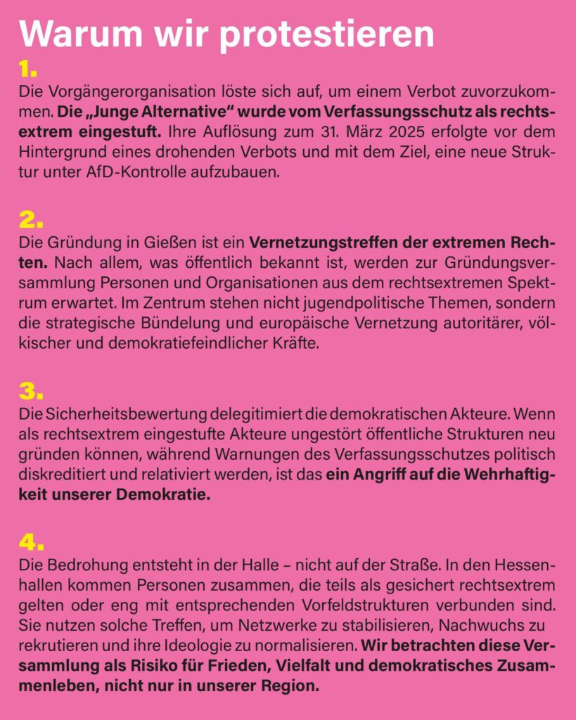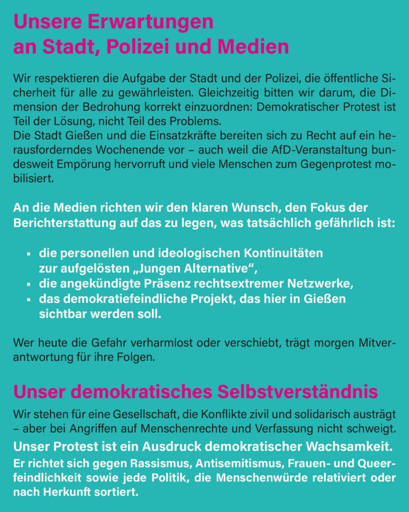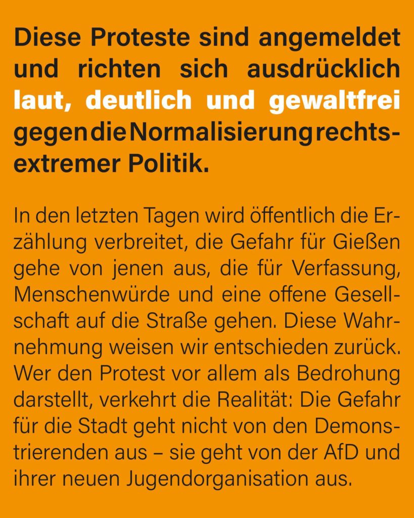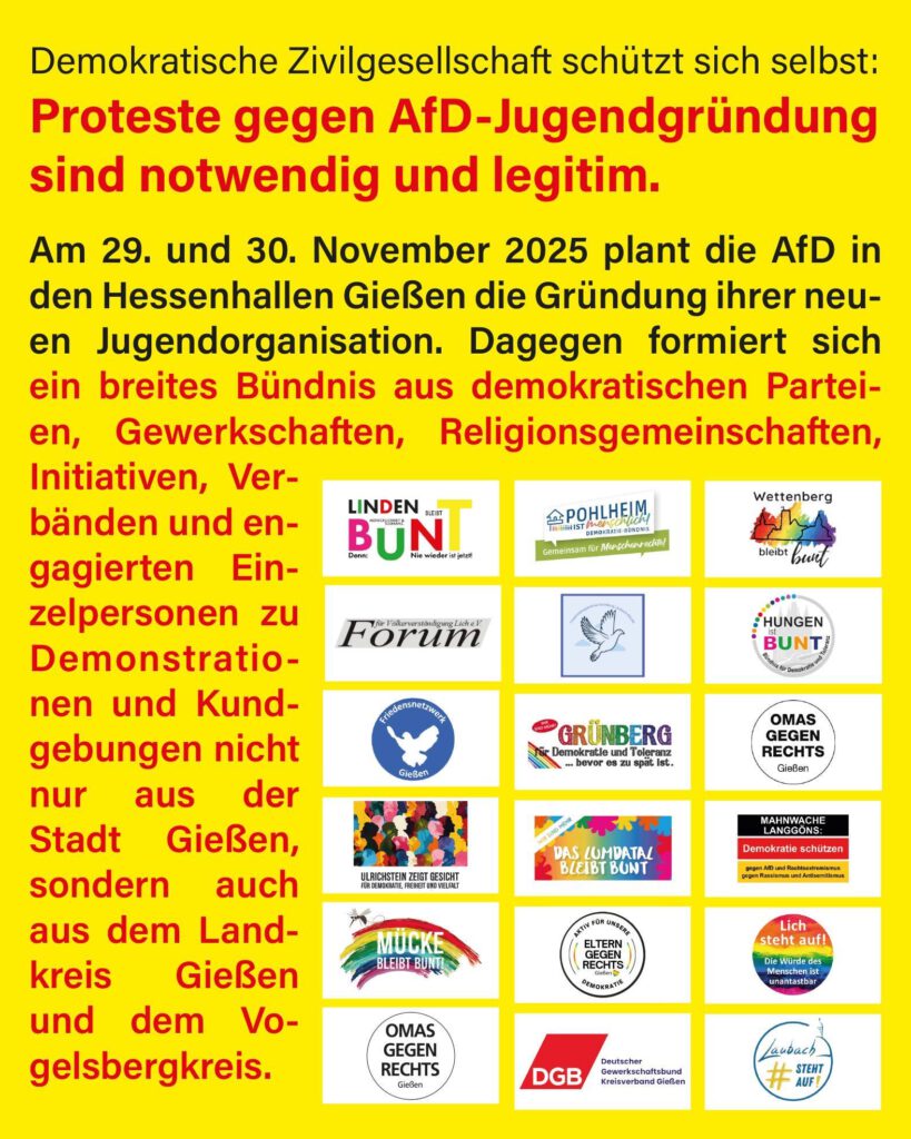 Wir waren am 29.11. mit rund 25 Personen auf der Demonstration in Gießen. Es war friedlich, demokratisch und – in jeder Beziehung – ein buntes Fest. Wir haben aber auch gesehen, dass Polizeigruppen – ohne erkennbare Gründe – sich durch Gruppen junger Leute geprügelt haben. Dazu ganz klar: Wir lehnen Gewalt – von welcher Seite auch immer – ab!