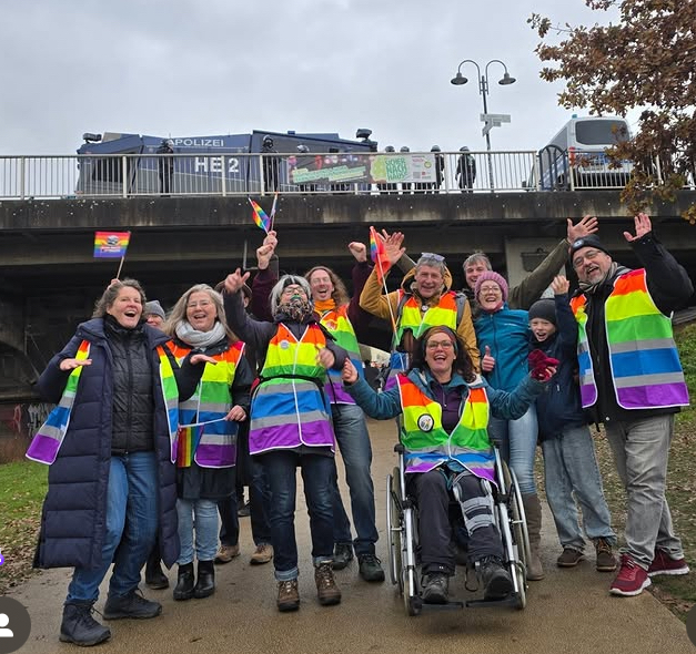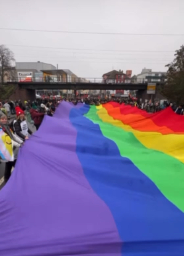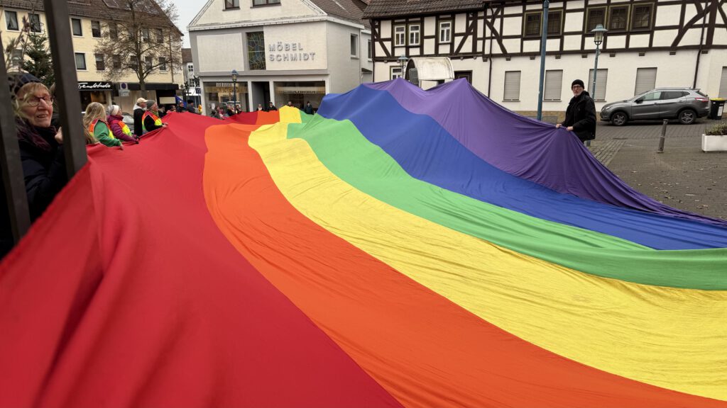Am 3.12.2025 hatten wir die 30m lange Regenbogenfahne zu Gast, die aktuell durch Hessen tourt. Rund 50 Menschen sind gekommen, um sie am Hungener Marktplatz zu entrollen. Danke, dass Ihr da wart!